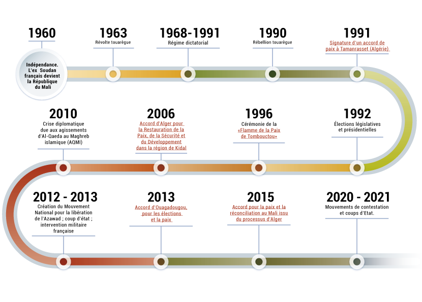 • En 2017, la Conférence d’Entente Nationale a été tenue à Bamako, suivie du Dialogue National Inclusif (DNI) en 2019. Ces deux assises ont notamment recommandé l’ouverture de pourparlers avec les chefs des groupes djihadistes Iyad Ad Galy et Hamadoun Kouffa.