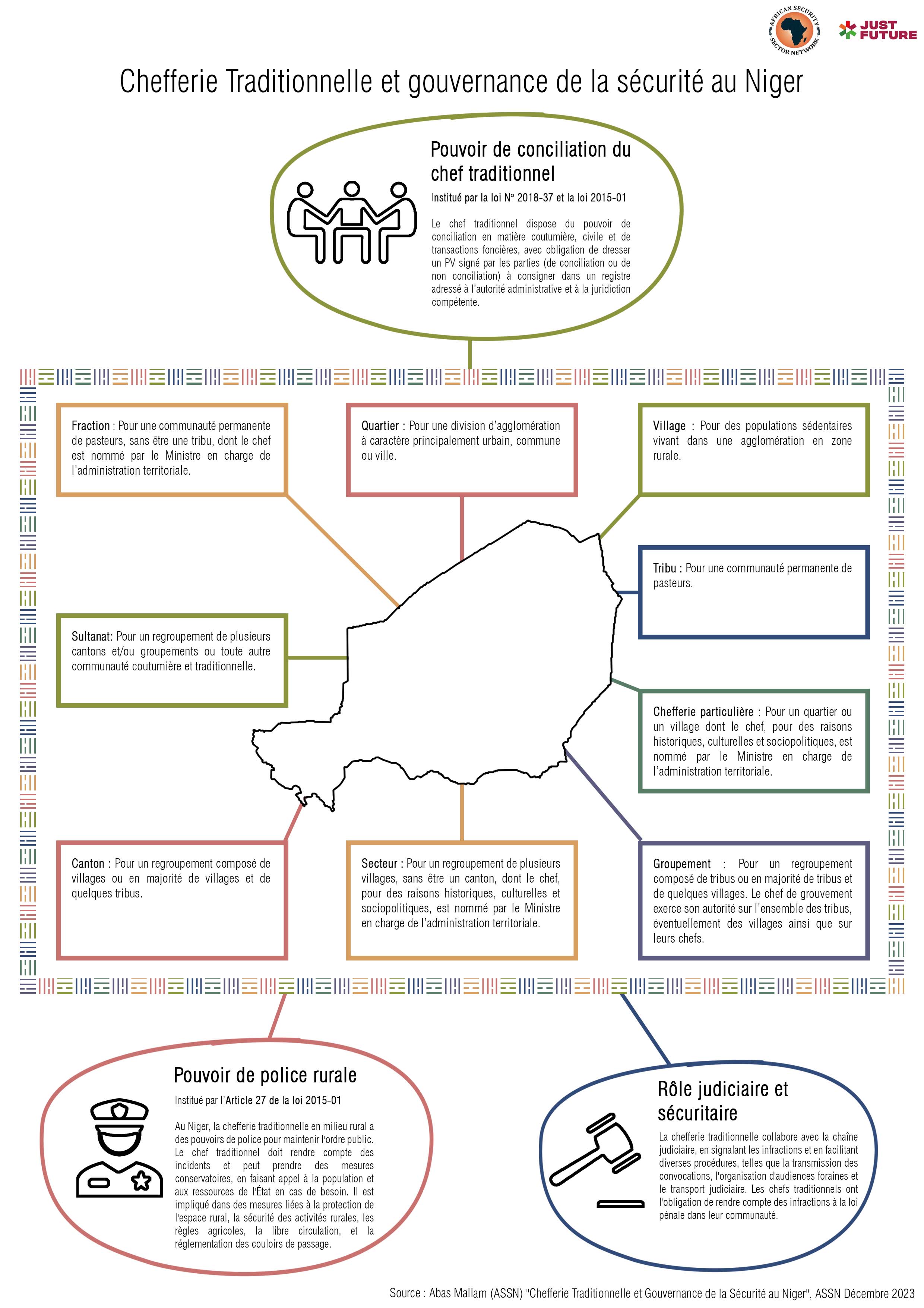 Disposant d’un maillage des plus complets avec une structuration et une hiérarchie du niveau le plus proche des populations (village, tribu ou quartier selon les zones et le type des populations) au niveau sultanat, la chefferie traditionnelle se présente actuellement comme un important acteur de la gouvernance sécuritaire au Niger. Représentant les communautés coutumières et traditionnelles qu’ils dirigent, dans leurs rapports avec l’administration et les tiers, les chefs traditionnels se positionnent comme des collaborateurs clefs de tous les autres acteurs de la gouvernance sécuritaire. La proximité avec la population, la reconnaissance par celle-ci de l’autorité des chefs traditionnels en font un maillon important de la gouvernance sécuritaire y compris en matière de renseignement et de fonctionnement de la chaîne judiciaire, notamment, la chaîne pénale.